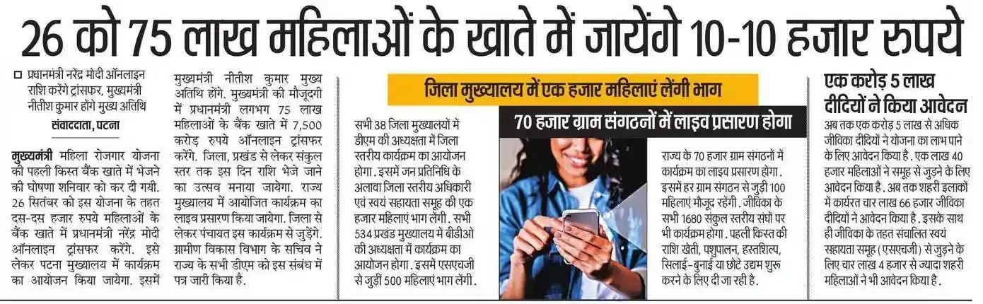 Bihar Mahila Rojgar Yojana First Installment 2025 : PM Modi 26 Sept को 75 Lakh महिलाओं के खाते में भेजेंगे ₹10-10 हजार
