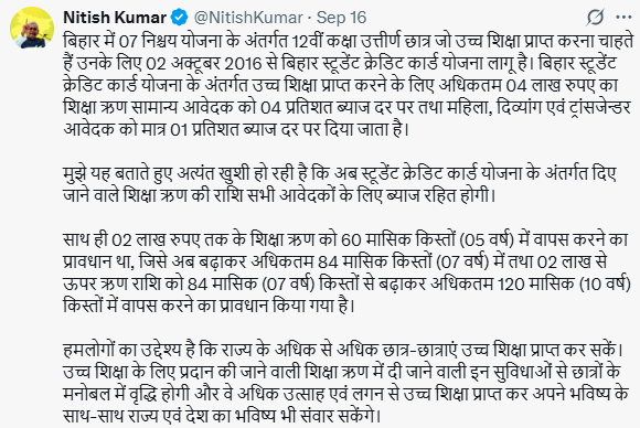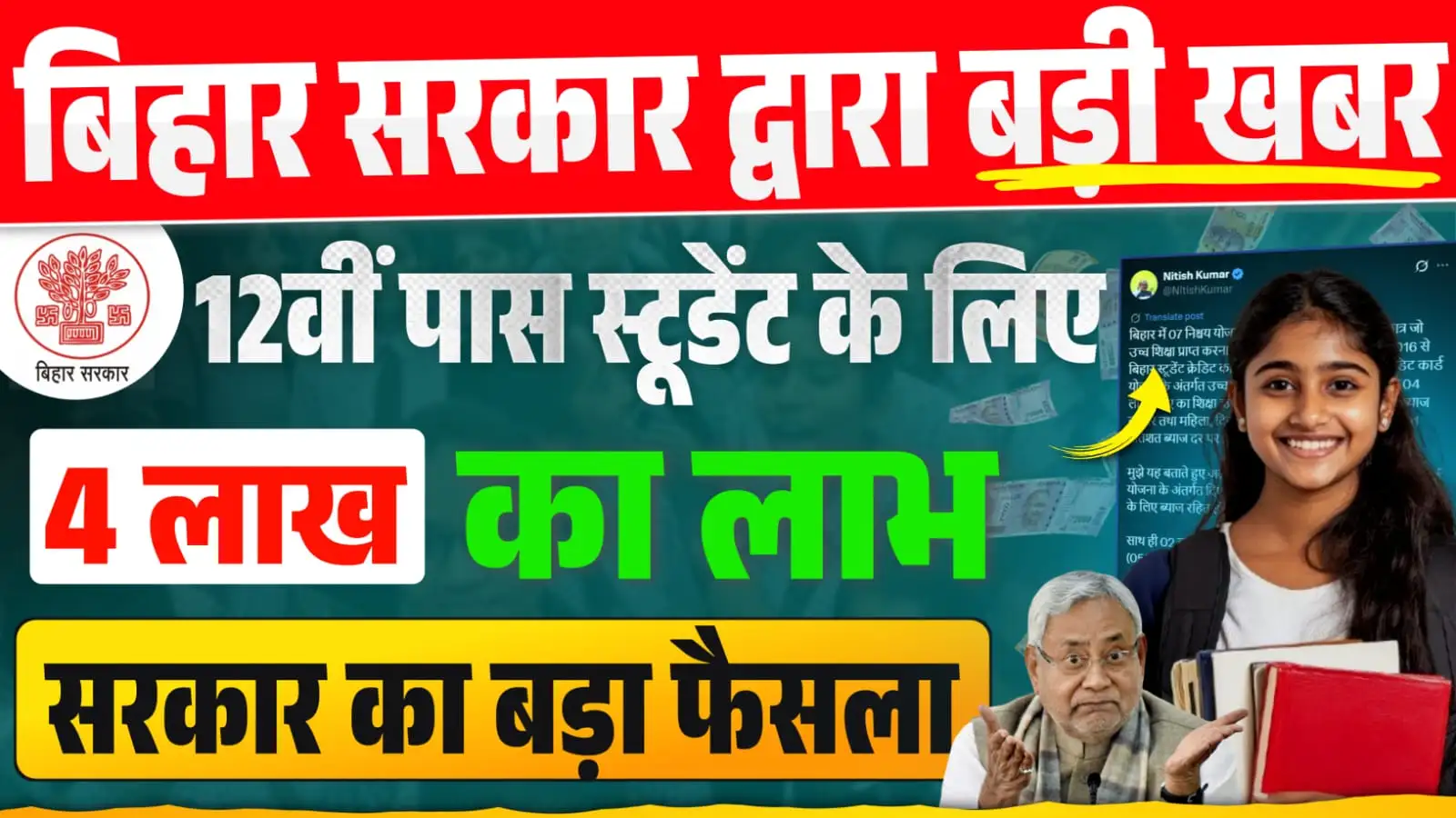 Bihar Student Credit Card Yojana Big Update 2025: बिहार सरकार ने छात्रों के लिए एक बड़ा कदम उठाया है। Bihar Student Credit Card Yojana Big Update 2025 में अब शिक्षा ऋण पूरी तरह ब्याज रहित हो गया है। यह योजना 7 निश्चय कार्यक्रम का हिस्सा है, जो 12वीं पास छात्रों को उच्च शिक्षा के लिए मदद देती है। मुख्यमंत्री नीतीश कुमार ने अपने X हैंडल पर इसकी घोषणा की, जिससे लाखों छात्र लाभान्वित होंगे।