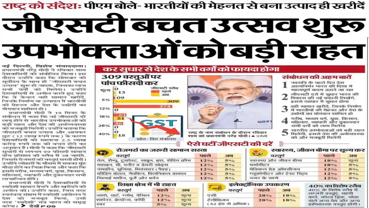 PM Modi GST Relief 2025: प्रधानमंत्री नरेंद्र मोदी ने रविवार शाम राष्ट्र को संबोधित करते हुए PM Modi GST Relief 2025 की बड़ी घोषणा की। उन्होंने कहा कि सोमवार से GST Savings Festival 2025 शुरू हो जाएगा जो सभी वर्गों को फायदा पहुंचाएगा। नई जीएसटी दरों से उपभोक्ताओं को सालाना 2.5 लाख करोड़ रुपये की बचत होगी। जीएसटी सुधार से 99 फीसदी वस्तुएं 5 प्रतिशत स्लैब में आ जाएंगी। त्योहारों के मौसम में गरीब मध्यम वर्ग युवा किसान महिलाएं व्यापारी और दुकानदार सबका मुंह मीठा होगा। मोदी ने अपील की कि केवल वही सामान खरीदें जिसमें भारतीयों की मेहनत लगी हो।